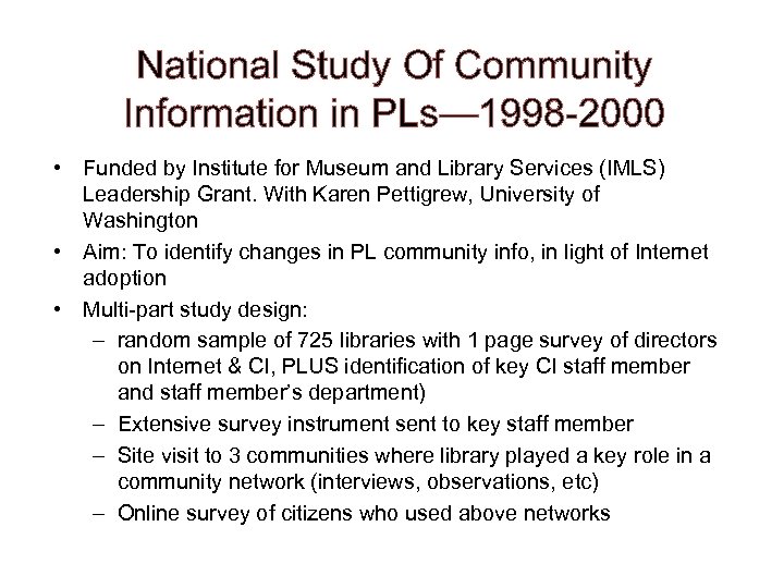 National Study Of Community Information in PLs— 1998 -2000 • Funded by Institute for Museum and Library Services (IMLS) Leadership Grant. With Karen Pettigrew, University of Washington • Aim: To identify changes in PL community info, in light of Internet adoption • Multi-part study design: – random sample of 725 libraries with 1 page survey of directors on Internet & CI, PLUS identification of key CI staff member and staff member’s department) – Extensive survey instrument sent to key staff member – Site visit to 3 communities where library played a key role in a community network (interviews, observations, etc) – Online survey of citizens who used above networks