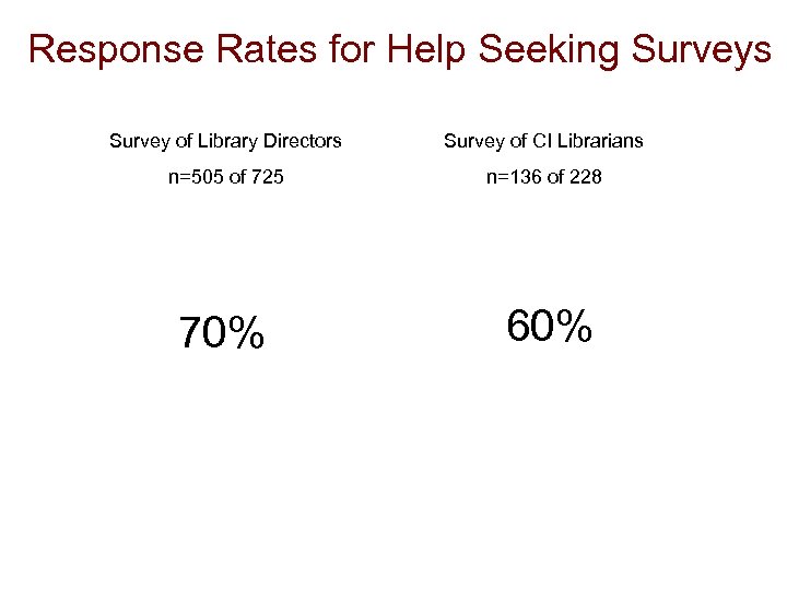 Response Rates for Help Seeking Surveys Survey of Library Directors Survey of CI Librarians n=505 of 725 n=136 of 228 70% 60%