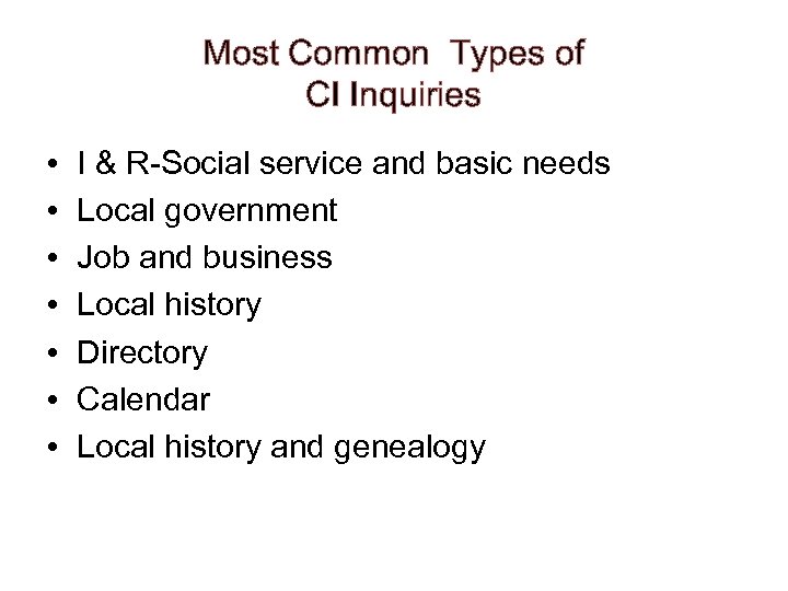 Most Common Types of CI Inquiries • • I & R-Social service and basic needs Local government Job and business Local history Directory Calendar Local history and genealogy