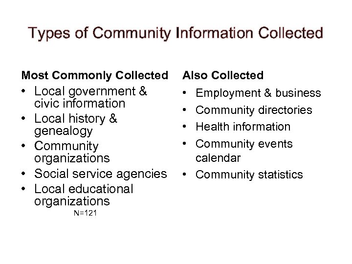 Types of Community Information Collected Most Commonly Collected Also Collected • Local government & civic information • Local history & genealogy • Community organizations • Social service agencies • Local educational organizations • • N=121 Employment & business Community directories Health information Community events calendar • Community statistics