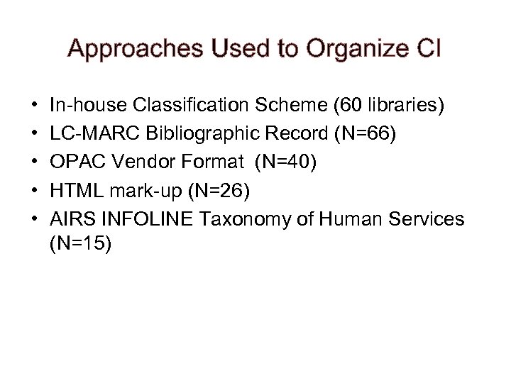 Approaches Used to Organize CI • • • In-house Classification Scheme (60 libraries) LC-MARC Bibliographic Record (N=66) OPAC Vendor Format (N=40) HTML mark-up (N=26) AIRS INFOLINE Taxonomy of Human Services (N=15)