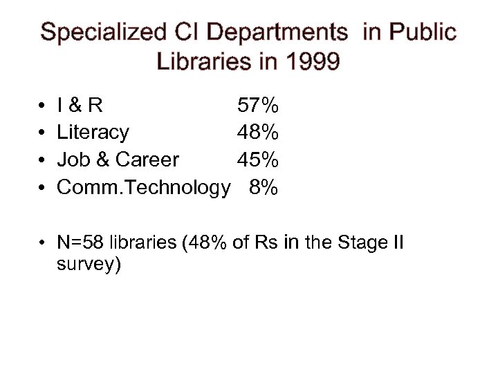 Specialized CI Departments in Public Libraries in 1999 • • I & R Literacy Job & Career Comm. Technology 57% 48% 45% 8% • N=58 libraries (48% of Rs in the Stage II survey)