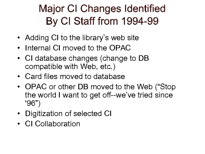 Major CI Changes Identified By CI Staff from 1994 -99 • Adding CI to the library’s web site • Internal CI moved to the OPAC • CI database changes (change to DB compatible with Web, etc. ) • Card files moved to database • OPAC or other DB moved to the Web (“Stop the world I want to get off--we’ve tried since ‘ 96”) • Digitization of selected CI • CI Collaboration