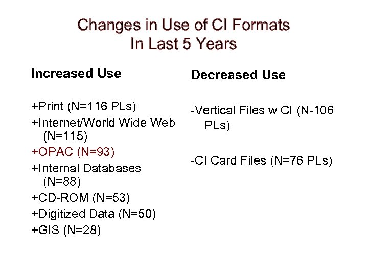Changes in Use of CI Formats In Last 5 Years Increased Use Decreased Use +Print (N=116 PLs) -Vertical Files w CI (N-106 +Internet/World Wide Web PLs) (N=115) +OPAC (N=93) -CI Card Files (N=76 PLs) +Internal Databases (N=88) +CD-ROM (N=53) +Digitized Data (N=50) +GIS (N=28)