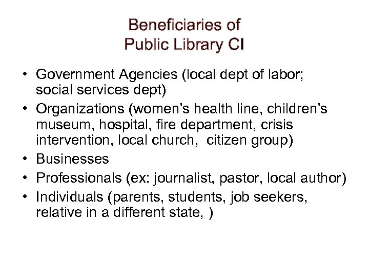 Beneficiaries of Public Library CI • Government Agencies (local dept of labor; social services dept) • Organizations (women’s health line, children’s museum, hospital, fire department, crisis intervention, local church, citizen group) • Businesses • Professionals (ex: journalist, pastor, local author) • Individuals (parents, students, job seekers, relative in a different state, )