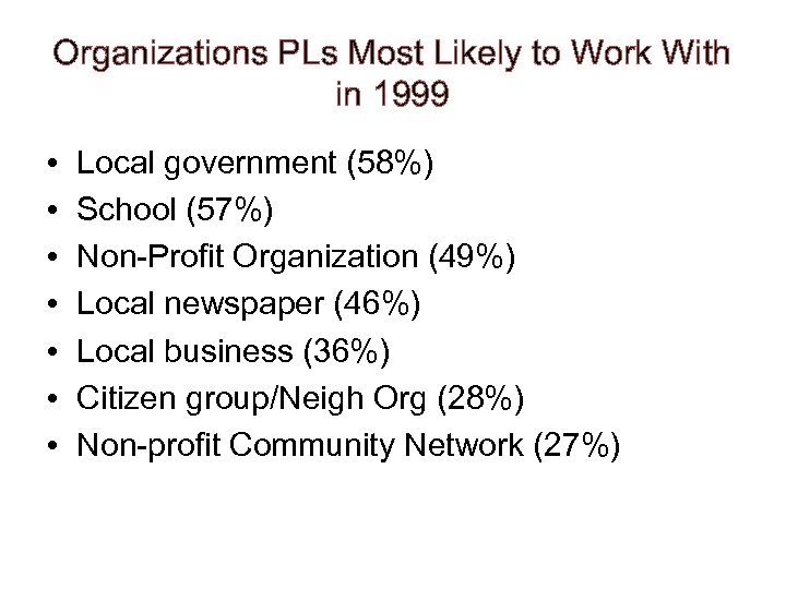 Organizations PLs Most Likely to Work With in 1999 • • Local government (58%) School (57%) Non-Profit Organization (49%) Local newspaper (46%) Local business (36%) Citizen group/Neigh Org (28%) Non-profit Community Network (27%)