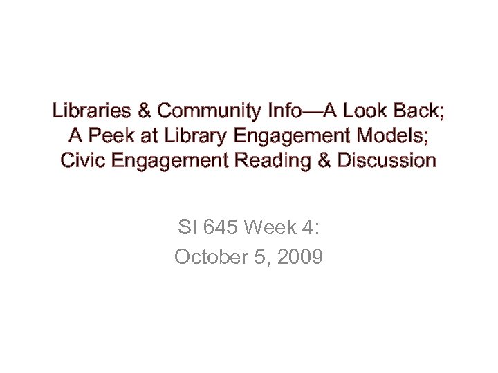 Libraries & Community Info—A Look Back; A Peek at Library Engagement Models; Civic Engagement Reading & Discussion SI 645 Week 4: October 5, 2009