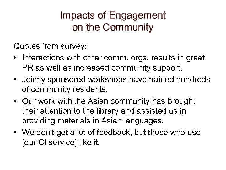 Impacts of Engagement on the Community Quotes from survey: • Interactions with other comm. orgs. results in great PR as well as increased community support. • Jointly sponsored workshops have trained hundreds of community residents. • Our work with the Asian community has brought their attention to the library and assisted us in providing materials in Asian languages. • We don’t get a lot of feedback, but those who use [our CI service] like it.