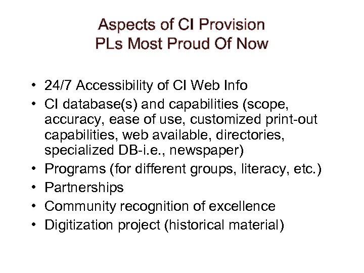 Aspects of CI Provision PLs Most Proud Of Now • 24/7 Accessibility of CI Web Info • CI database(s) and capabilities (scope, accuracy, ease of use, customized print-out capabilities, web available, directories, specialized DB-i. e. , newspaper) • Programs (for different groups, literacy, etc. ) • Partnerships • Community recognition of excellence • Digitization project (historical material)