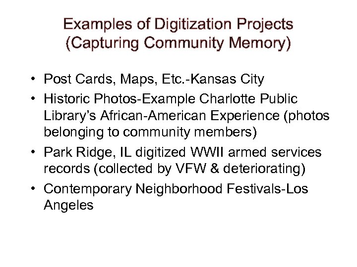 Examples of Digitization Projects (Capturing Community Memory) • Post Cards, Maps, Etc. -Kansas City • Historic Photos-Example Charlotte Public Library’s African-American Experience (photos belonging to community members) • Park Ridge, IL digitized WWII armed services records (collected by VFW & deteriorating) • Contemporary Neighborhood Festivals-Los Angeles
