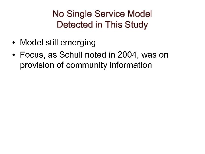 No Single Service Model Detected in This Study • Model still emerging • Focus, as Schull noted in 2004, was on provision of community information