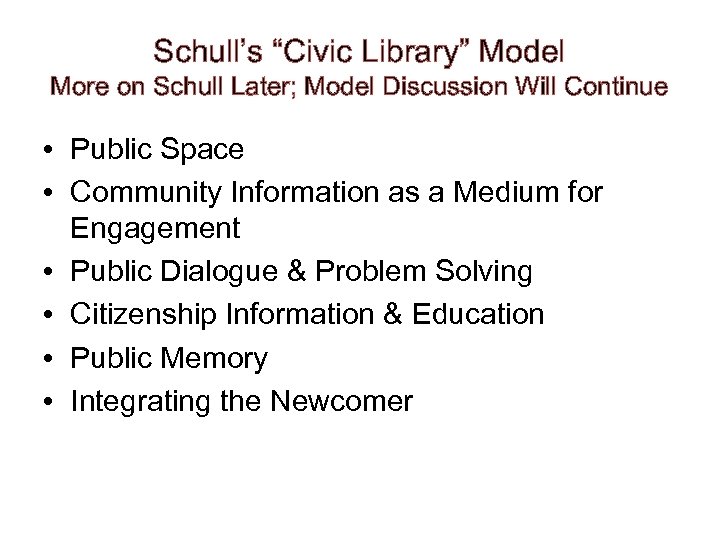 Schull’s “Civic Library” Model More on Schull Later; Model Discussion Will Continue • Public Space • Community Information as a Medium for Engagement • Public Dialogue & Problem Solving • Citizenship Information & Education • Public Memory • Integrating the Newcomer