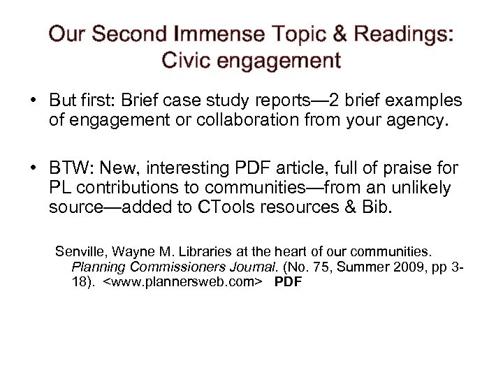 Our Second Immense Topic & Readings: Civic engagement • But first: Brief case study reports— 2 brief examples of engagement or collaboration from your agency. • BTW: New, interesting PDF article, full of praise for PL contributions to communities—from an unlikely source—added to CTools resources & Bib. Senville, Wayne M. Libraries at the heart of our communities. Planning Commissioners Journal. (No. 75, Summer 2009, pp 318).