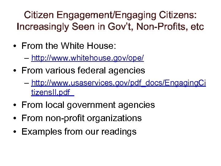 Citizen Engagement/Engaging Citizens: Increasingly Seen in Gov’t, Non-Profits, etc • From the White House: – http: //www. whitehouse. gov/ope/ • From various federal agencies – http: //www. usaservices. gov/pdf_docs/Engaging. Ci tizens. II. pdf • From local government agencies • From non-profit organizations • Examples from our readings