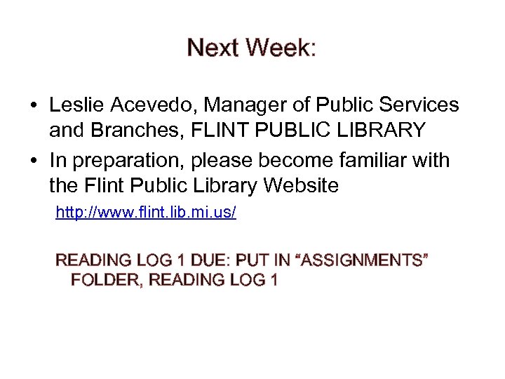 Next Week: • Leslie Acevedo, Manager of Public Services and Branches, FLINT PUBLIC LIBRARY • In preparation, please become familiar with the Flint Public Library Website http: //www. flint. lib. mi. us/ READING LOG 1 DUE: PUT IN “ASSIGNMENTS” FOLDER, READING LOG 1