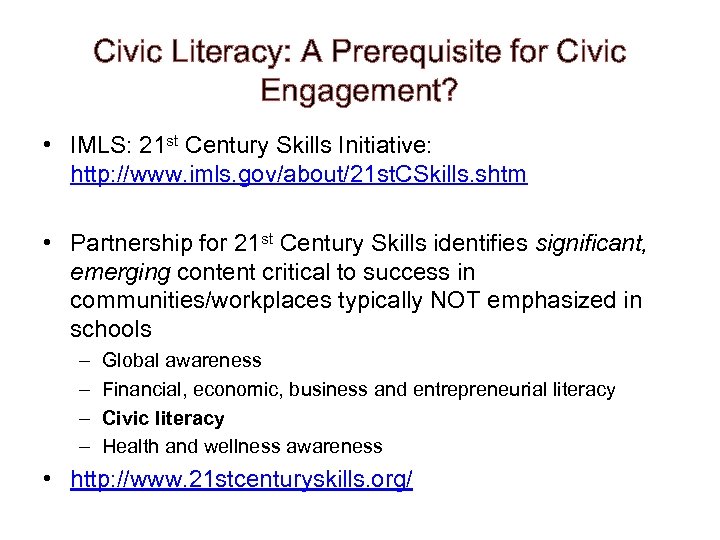 Civic Literacy: A Prerequisite for Civic Engagement? • IMLS: 21 st Century Skills Initiative: http: //www. imls. gov/about/21 st. CSkills. shtm • Partnership for 21 st Century Skills identifies significant, emerging content critical to success in communities/workplaces typically NOT emphasized in schools – – Global awareness Financial, economic, business and entrepreneurial literacy Civic literacy Health and wellness awareness • http: //www. 21 stcenturyskills. org/
