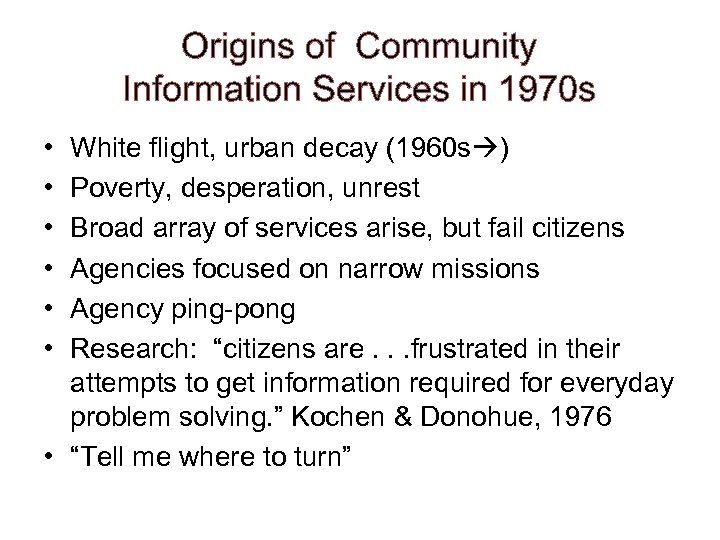 Origins of Community Information Services in 1970 s • • • White flight, urban decay (1960 s ) Poverty, desperation, unrest Broad array of services arise, but fail citizens Agencies focused on narrow missions Agency ping-pong Research: “citizens are. . . frustrated in their attempts to get information required for everyday problem solving. ” Kochen & Donohue, 1976 • “Tell me where to turn”