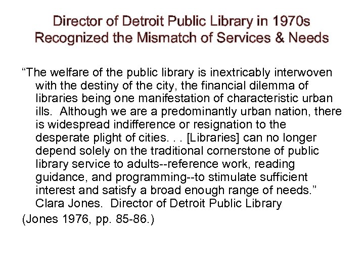 Director of Detroit Public Library in 1970 s Recognized the Mismatch of Services & Needs “The welfare of the public library is inextricably interwoven with the destiny of the city, the financial dilemma of libraries being one manifestation of characteristic urban ills. Although we are a predominantly urban nation, there is widespread indifference or resignation to the desperate plight of cities. . . [Libraries] can no longer depend solely on the traditional cornerstone of public library service to adults--reference work, reading guidance, and programming--to stimulate sufficient interest and satisfy a broad enough range of needs. ” Clara Jones. Director of Detroit Public Library (Jones 1976, pp. 85 -86. )