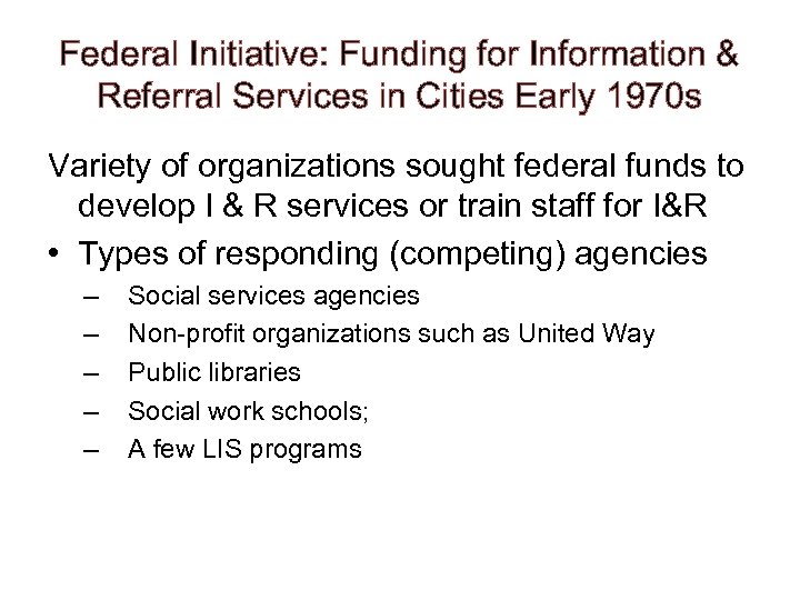 Federal Initiative: Funding for Information & Referral Services in Cities Early 1970 s Variety of organizations sought federal funds to develop I & R services or train staff for I&R • Types of responding (competing) agencies – – – Social services agencies Non-profit organizations such as United Way Public libraries Social work schools; A few LIS programs