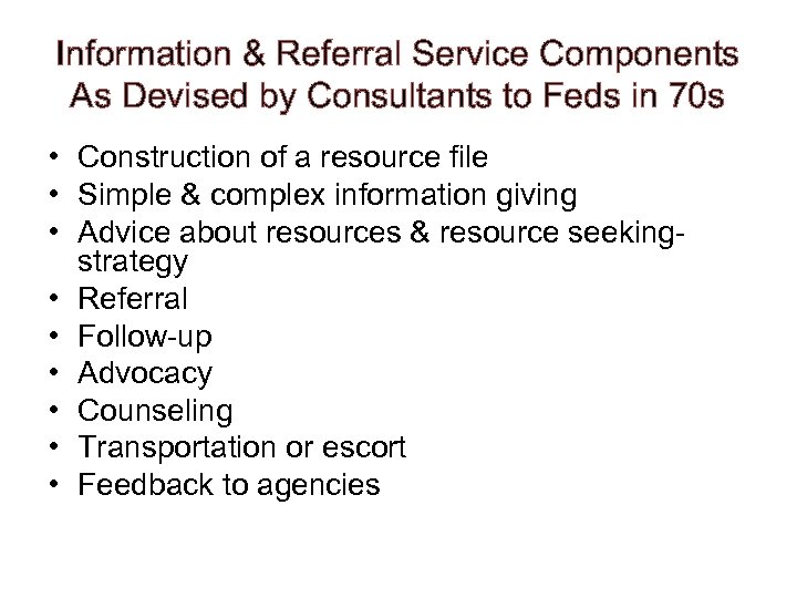 Information & Referral Service Components As Devised by Consultants to Feds in 70 s • Construction of a resource file • Simple & complex information giving • Advice about resources & resource seekingstrategy • Referral • Follow-up • Advocacy • Counseling • Transportation or escort • Feedback to agencies