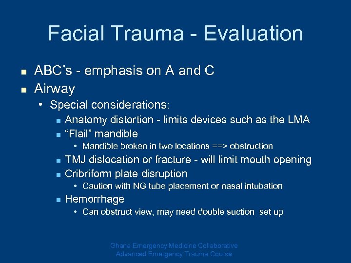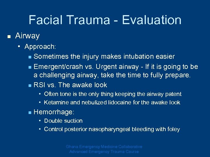 Facial Trauma - Evaluation n Airway • Approach: n Sometimes the injury makes intubation easier n Emergent/crash vs. Urgent airway - If it is going to be a challenging airway, take the time to fully prepare. n RSI vs. The awake look • Often tone is the only thing keeping the airway patent • Ketamine and nebulized lidocaine for the awake look n Hemorrhage: • Double suction • Control posterior nasopharyngeal bleeding with foley Ghana Emergency Medicine Collaborative Advanced Emergency Trauma Course