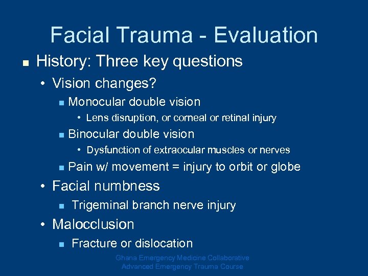 Facial Trauma - Evaluation n History: Three key questions • Vision changes? n Monocular double vision • Lens disruption, or corneal or retinal injury n Binocular double vision • Dysfunction of extraocular muscles or nerves n Pain w/ movement = injury to orbit or globe • Facial numbness n Trigeminal branch nerve injury • Malocclusion n Fracture or dislocation Ghana Emergency Medicine Collaborative Advanced Emergency Trauma Course