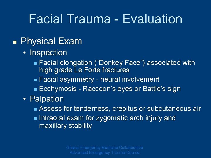 Facial Trauma - Evaluation n Physical Exam • Inspection Facial elongation (“Donkey Face”) associated with high grade Le Forte fractures n Facial asymmetry - neural involvement n Ecchymosis - Raccoon’s eyes or Battle’s sign n • Palpation Assess for tenderness, crepitus or subcutaneous air n Intraoral exam for zygomatic arch injury and maxillary stability n Ghana Emergency Medicine Collaborative Advanced Emergency Trauma Course