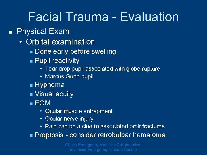 Facial Trauma - Evaluation n Physical Exam • Orbital examination Done early before swelling n Pupil reactivity n • Tear drop pupil associated with globe rupture • Marcus Gunn pupil Hyphema n Visual acuity n EOM n • Ocular muscle entrapment • Ocular nerve injury • Pain can be a clue to associated orbit fractures n Proptosis - consider retrobulbar hematoma Ghana Emergency Medicine Collaborative Advanced Emergency Trauma Course