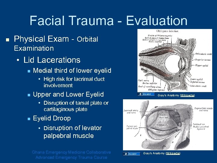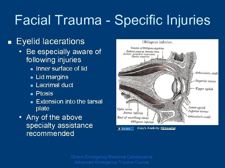 Facial Trauma - Specific Injuries n Eyelid lacerations • Be especially aware of following injuries n n n Inner surface of lid Lid margins Lacrimal duct Ptosis Extension into the tarsal plate • Any of the above specialty assistance recommended Gray’s Anatomy (Wikipedia) Ghana Emergency Medicine Collaborative Advanced Emergency Trauma Course