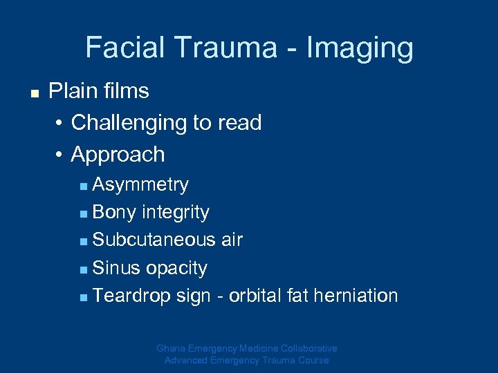 Facial Trauma - Imaging n Plain films • Challenging to read • Approach Asymmetry n Bony integrity n Subcutaneous air n Sinus opacity n Teardrop sign - orbital fat herniation n Ghana Emergency Medicine Collaborative Advanced Emergency Trauma Course