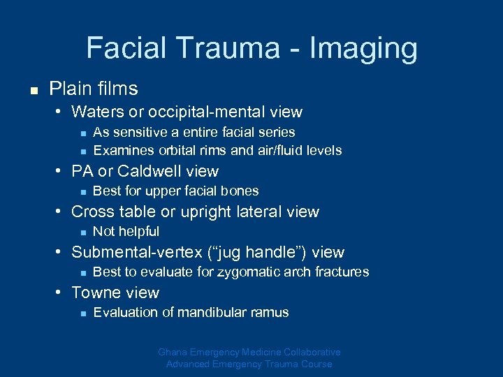 Facial Trauma - Imaging n Plain films • Waters or occipital-mental view n n As sensitive a entire facial series Examines orbital rims and air/fluid levels • PA or Caldwell view n Best for upper facial bones • Cross table or upright lateral view n Not helpful • Submental-vertex (“jug handle”) view n Best to evaluate for zygomatic arch fractures • Towne view n Evaluation of mandibular ramus Ghana Emergency Medicine Collaborative Advanced Emergency Trauma Course