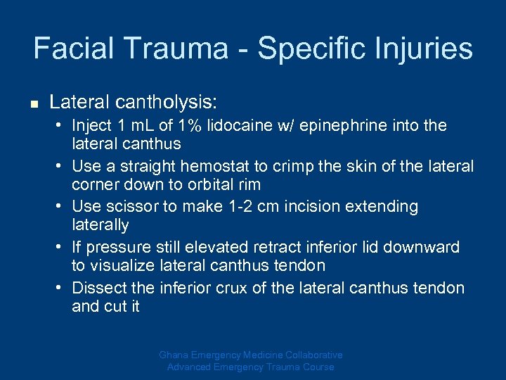 Facial Trauma - Specific Injuries n Lateral cantholysis: • Inject 1 m. L of 1% lidocaine w/ epinephrine into the lateral canthus • Use a straight hemostat to crimp the skin of the lateral corner down to orbital rim • Use scissor to make 1 -2 cm incision extending laterally • If pressure still elevated retract inferior lid downward to visualize lateral canthus tendon • Dissect the inferior crux of the lateral canthus tendon and cut it Ghana Emergency Medicine Collaborative Advanced Emergency Trauma Course