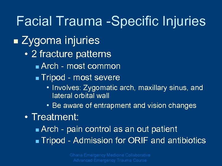 Facial Trauma -Specific Injuries n Zygoma injuries • 2 fracture patterns Arch - most common n Tripod - most severe n • Involves: Zygomatic arch, maxillary sinus, and lateral orbital wall • Be aware of entrapment and vision changes • Treatment: Arch - pain control as an out patient n Tripod - Admission for ORIF and antibiotics n Ghana Emergency Medicine Collaborative Advanced Emergency Trauma Course