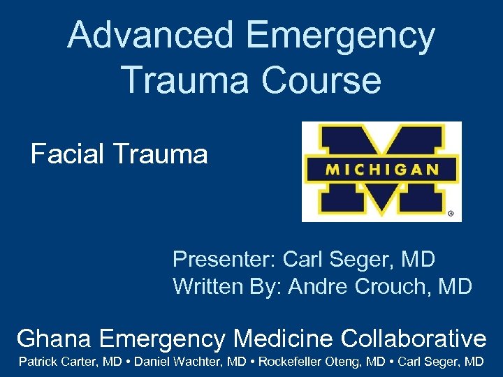 Advanced Emergency Trauma Course Facial Trauma Presenter: Carl Seger, MD Written By: Andre Crouch, MD Ghana Emergency Medicine Collaborative Patrick Carter, MD ∙ Daniel Wachter, MD ∙ Rockefeller Oteng, MD ∙ Carl Seger, MD