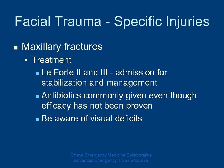 Facial Trauma - Specific Injuries n Maxillary fractures • Treatment n Le Forte II and III - admission for stabilization and management n Antibiotics commonly given even though efficacy has not been proven n Be aware of visual deficits Ghana Emergency Medicine Collaborative Advanced Emergency Trauma Course