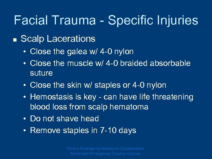 Facial Trauma - Specific Injuries n Scalp Lacerations • Close the galea w/ 4 -0 nylon • Close the muscle w/ 4 -0 braided absorbable suture • Close the skin w/ staples or 4 -0 nylon • Hemostasis is key - can have life threatening blood loss from scalp hematoma • Do not shave head • Remove staples in 7 -10 days Ghana Emergency Medicine Collaborative Advanced Emergency Trauma Course