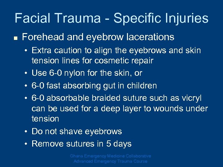 Facial Trauma - Specific Injuries n Forehead and eyebrow lacerations • Extra caution to align the eyebrows and skin tension lines for cosmetic repair • Use 6 -0 nylon for the skin, or • 6 -0 fast absorbing gut in children • 6 -0 absorbable braided suture such as vicryl can be used for a deep layer to wounds under tension • Do not shave eyebrows • Remove sutures in 5 days Ghana Emergency Medicine Collaborative Advanced Emergency Trauma Course