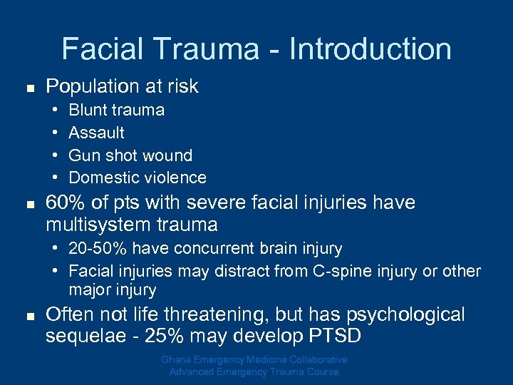 Facial Trauma - Introduction n Population at risk • • n Blunt trauma Assault Gun shot wound Domestic violence 60% of pts with severe facial injuries have multisystem trauma • 20 -50% have concurrent brain injury • Facial injuries may distract from C-spine injury or other major injury n Often not life threatening, but has psychological sequelae - 25% may develop PTSD Ghana Emergency Medicine Collaborative Advanced Emergency Trauma Course