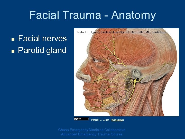 Facial Trauma - Anatomy n n Facial nerves Parotid gland Patrick J. Lynch, medical illustrator; C. Carl Jaffe, MD, cardiologist. Patrick J. Lynch, (Wikipedia) Ghana Emergency Medicine Collaborative Advanced Emergency Trauma Course