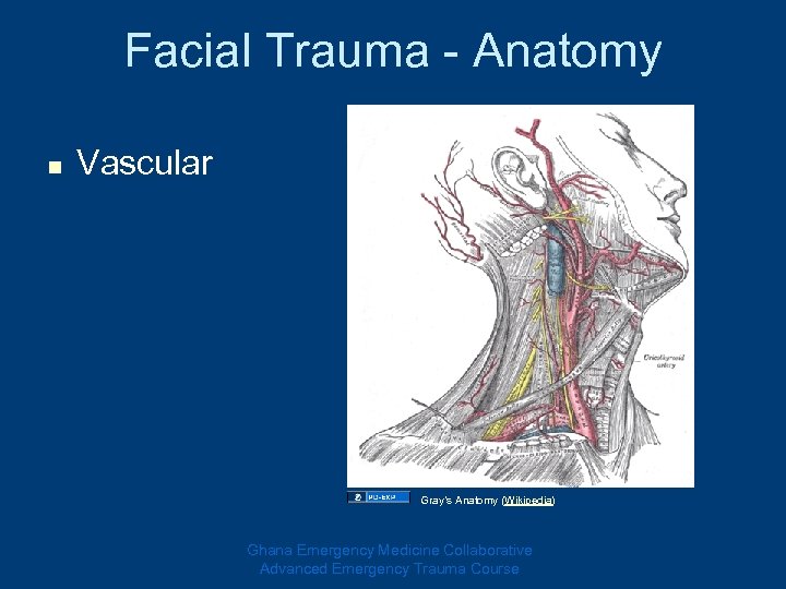 Facial Trauma - Anatomy n Vascular Gray’s Anatomy (Wikipedia) Ghana Emergency Medicine Collaborative Advanced Emergency Trauma Course