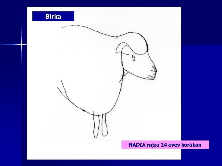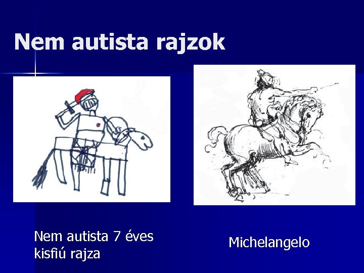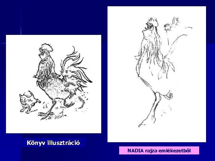 n n n AUTISTÁK KIEMELKEDÔ VIZUÁLIS KÉPESSÉGEINEK LEHETSÉGES INDOKAI 1) A rajz nem lehet „gyermeki nyelv” a beszédfejlődés gátjai miatt, nem is alapulhat fogalmi gondolkodásra 2) A rajz marad az „elsődleges szimbolikus reprezentáció” (Vigotszkij), nincs elnevezés, tematikus kényszer 3) A dolgok térbelisége fontosabb, mint minősége, működése, stb. - ez a domináns megismerési mód Lorna SELFE: Nadia - A Case of Extraordinary Drawing Ability of a Child. London, New York: Academic Press, 1977 Lorna SELFE: Normal and Anomalous Representational Drawing Ability in Children. London, New York: Academic Press, 1983