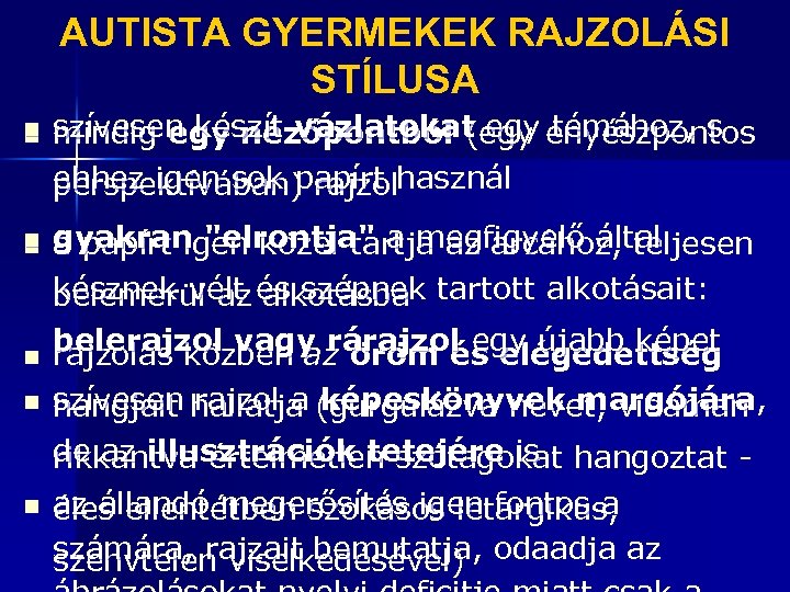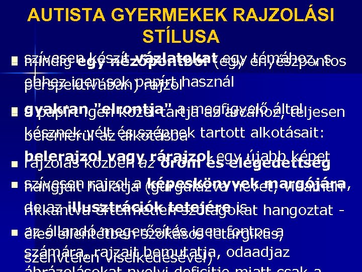 AUTISTA GYERMEKEK RAJZOLÁSI STÍLUSA n n n n szívesen készít vázlatokat egy enyészpontos mindig egy nézőpontból (egy témához, s ehhez igen sok papírt használ perspektívában) rajzol gyakran "elrontja" a megfigyelő által a papírt igen közel tartja az arcához, teljesen késznek vélt és szépnek tartott alkotásait: belemerül az alkotásba belerajzol vagy rárajzol egy újabb képet rajzolás közben az öröm és elégedettség szívesen hallatja (gurgulázva nevet, vidáman , hangjait rajzol a képeskönyvek margójára de az illusztrációk tetejére is hangoztat rikkantva értelmetlen szótagokat az állandó megerősítés igen fontos a éles ellentétben szokásos letargikus, számára, rajzait bemutatja, odaadja az szenvtelen viselkedésével)