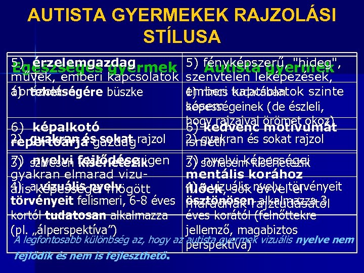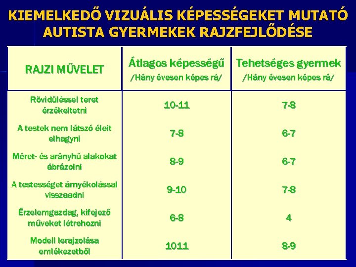KIEMELKEDŐ VIZUÁLIS KÉPESSÉGEKET MUTATÓ AUTISTA GYERMEKEK RAJZFEJLŐDÉSE RAJZI MŰVELET Átlagos képességű Tehetséges gyermek /Hány évesen képes rá/ Rövidüléssel teret érzékeltetni 10 -11 7 -8 A testek nem látszó éleit elhagyni 7 -8 6 -7 Méret- és arányhű alakokat ábrázolni 8 -9 6 -7 A testességet árnyékolással visszaadni 9 -10 7 -8 Érzelemgazdag, kifejező műveket létrehozni 6 -8 4 Modell lerajzolása emlékezetből 1011 8 -9