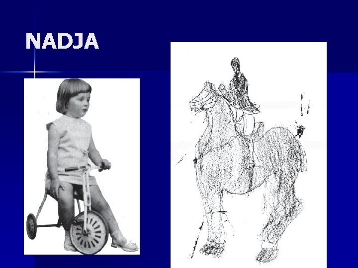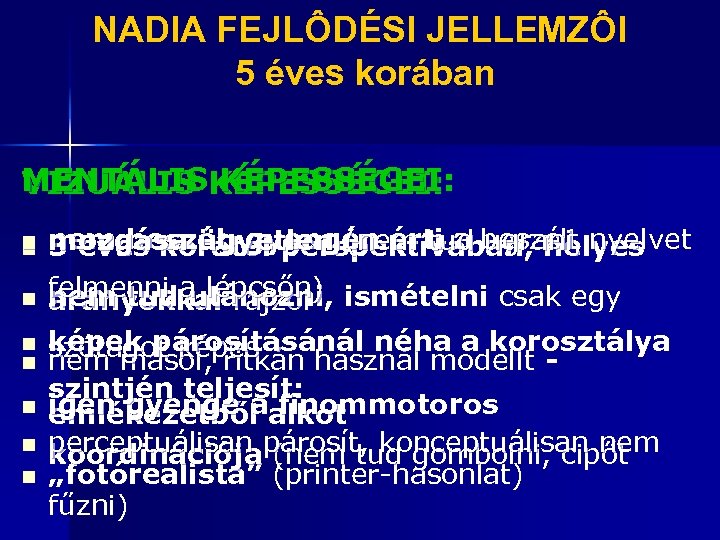 NADIA FEJLÔDÉSI JELLEMZÔI 5 éves korában MENTÁLISKÉPESSÉGEI: VIZUÁLIS KÉPESSÉGEI: n n n n nem beszél, gyengén érti a beszélt nyelvet mozgása ügyetlen (nem tud ugrani, 3 éves korától perspektívában, helyes felmenni a lépcsőn) ismételni csak egy nem tud utánozni, arányokkal rajzol képek párosításánál néha a korosztálya szótagot képes nem másol, ritkán használ modellt szintjén teljesít: igen gyenge aalkot emlékezetből finommotoros perceptuálisan párosít, konceptuálisan nem koordinációja (nem tud gombolni, cipőt „fotórealista” (printer-hasonlat) fűzni)