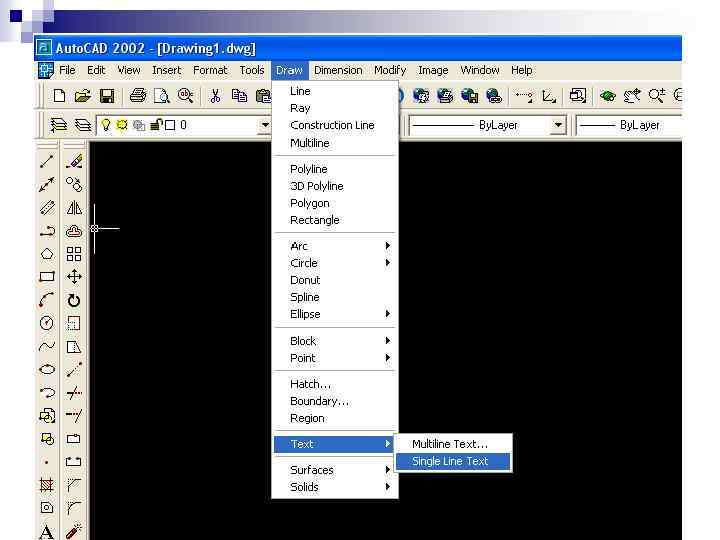 2. Текст в кресленнях Auto. Cad В системі Auto. CAD передбачено створення на кресленні двох видів тексту: – однорядкового, – багаторядкового. Способи створення однорядкового надпису: n. Draw – Text – Single Line Text; n. Ввести к командний рядок: Text; n. Обрати на панелі інструментів Text.