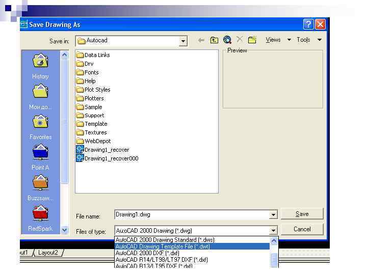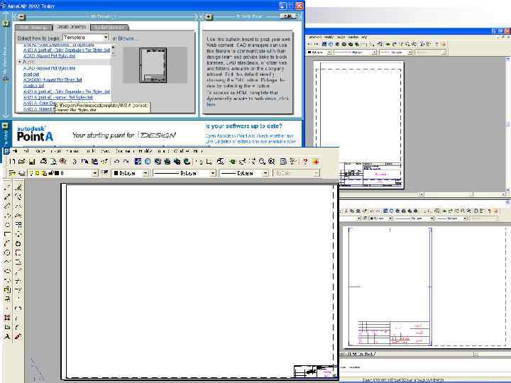 1. Використання шаблонів у програмі Auto. Cad Етапи створення шаблонів: n Створити креслення, яке буде використовуватися в якості шаблону (наприклад пусте креслення формату А 4 з накресленою рамкою і штампом); n Зберегти це креслення: File-Save as. У вікні Save Drawing as у полі тип файлу потрібно обрати тип. dwt. Задати ім'я файлу і натиснути ОК. n В діалоговому вікні Параметри шаблону – ввести його характеристику.
