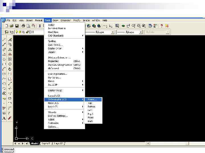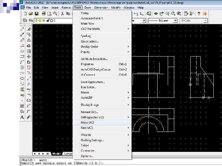 Простір і компоновка креслення n Простір моделі (Model Space) – це простір Auto. Cad, в якому відбувається формування моделі об’єктів, як при двомірному, так і при тримірному моделюванні. Ознакою встановленого в даний час простору моделі є піктограма КСК в робочому просторі креслення і індикація кнопки Model