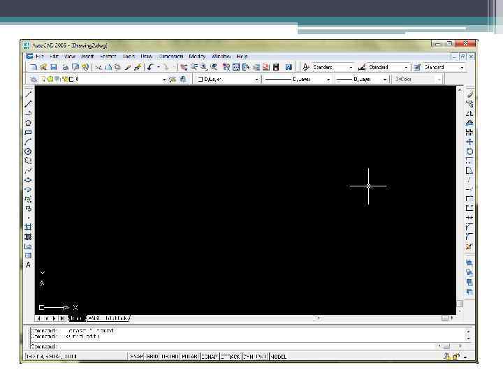 Команда Line • Выполняется через меню Draw -> Line • 1) Путем указание точек с помощью мыши • 2) Путем ввода в командной строке слова Line После этого вводим начальную точку в виде «X, Y» и далее сколько необходимо. Завершаем построение линии нажатием клавиши ESC.