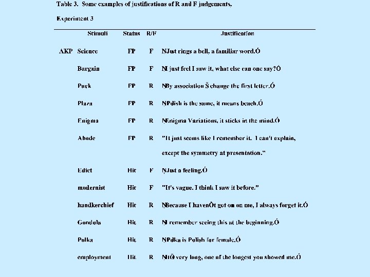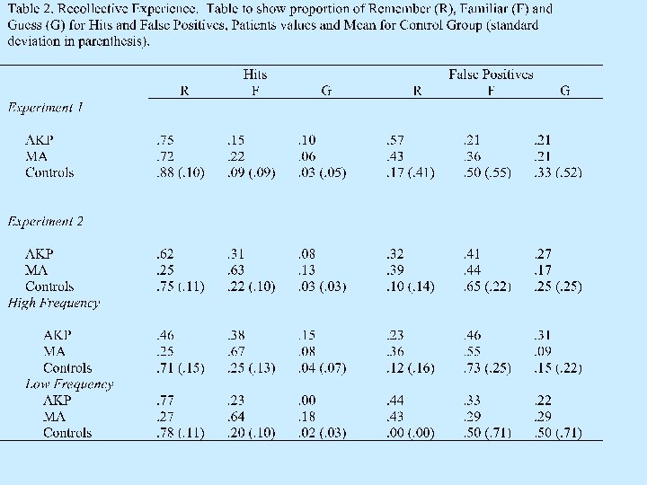Summary • AKP and MA have: False recognition Appropriate confidence judgements Poor recall (but not as bad as recog. ) Recollective experience for the present • They suffer from “Recollective Confabulation” • Moreover they also act upon the (inappropriate) feeling of remembering