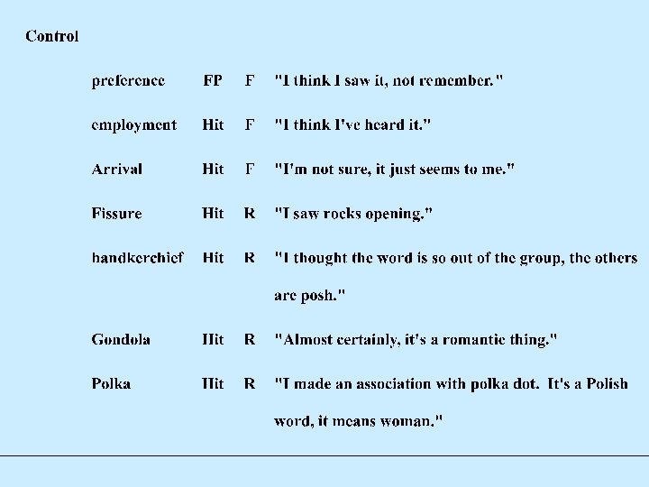 Percentage Recognition of Memories and Confabulations (as memories). Accurate Memories (N=20) Spontaneous Confabulations (N=20) ‘Experimental’ Confabulations (N=20) AO 100 70 30 DO 100 85 30 LH 95 40 25 RM 100 95 35 OT 65 35 35 Patients